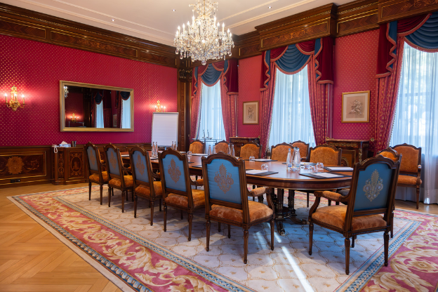 The Elysée lounge is elegant and intimate. It offers direct access to a terrace with views of the gardens and Lake Geneva. The centre of the room is furnished with a large royal table of solid wood. Featuring delicate inlaid work and richly decorated with sumptuous fabrics and curtains from Italy, this venue is ideal for board meetings or small conferences.